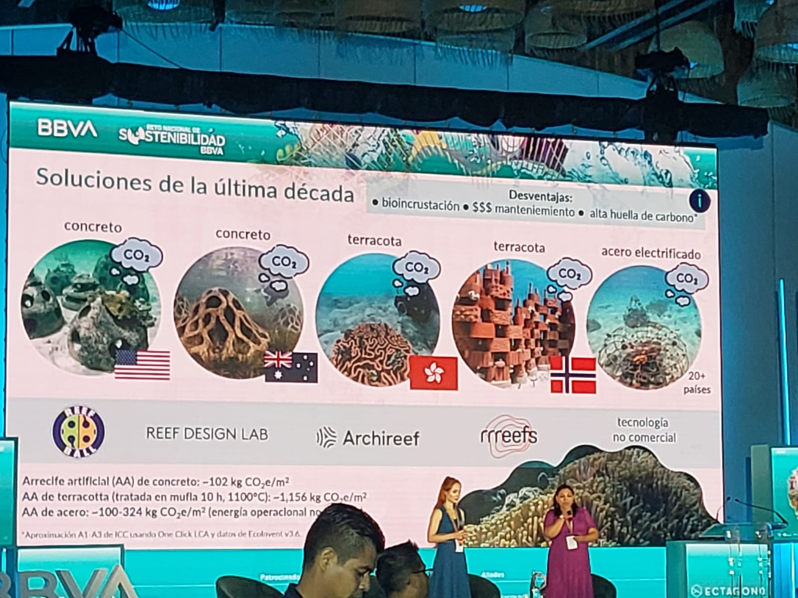 La propuesta que presentaron las participantes para resolver la problemática de los corales es un domo modular, impreso en 3D a base de residuo de sargazo y arcilla, que tiene un recubrimiento a base de extracto de sargazo para evitar su mantenimiento.