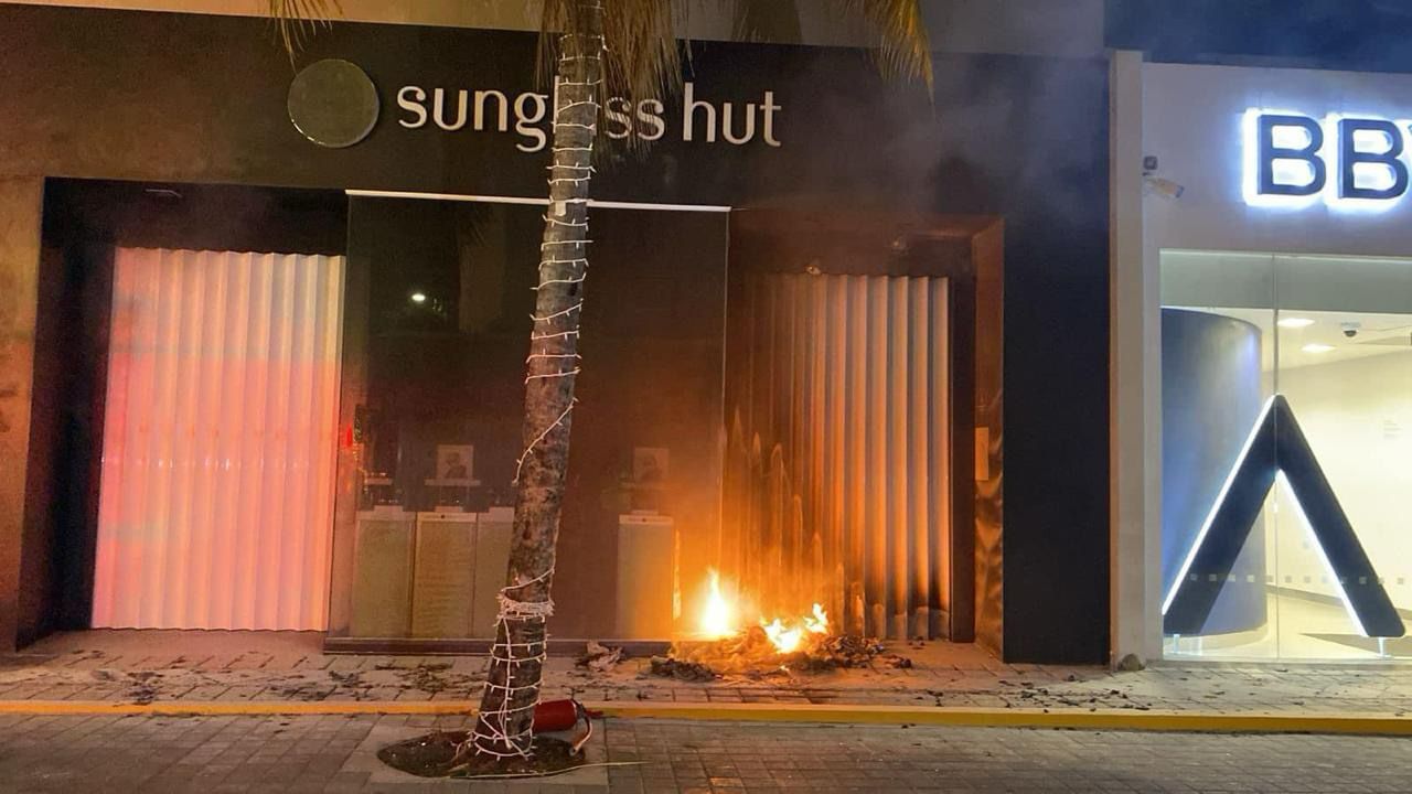 Playa del Carmen.- Dos locales comerciales que se dedican a la venta de lentes de sol fueron atacados la madrugada de hoy con bombas molotov, esto sobre la turística Quinta Avenida de esta ciudad. No hubo lesionados, solo daños materiales.