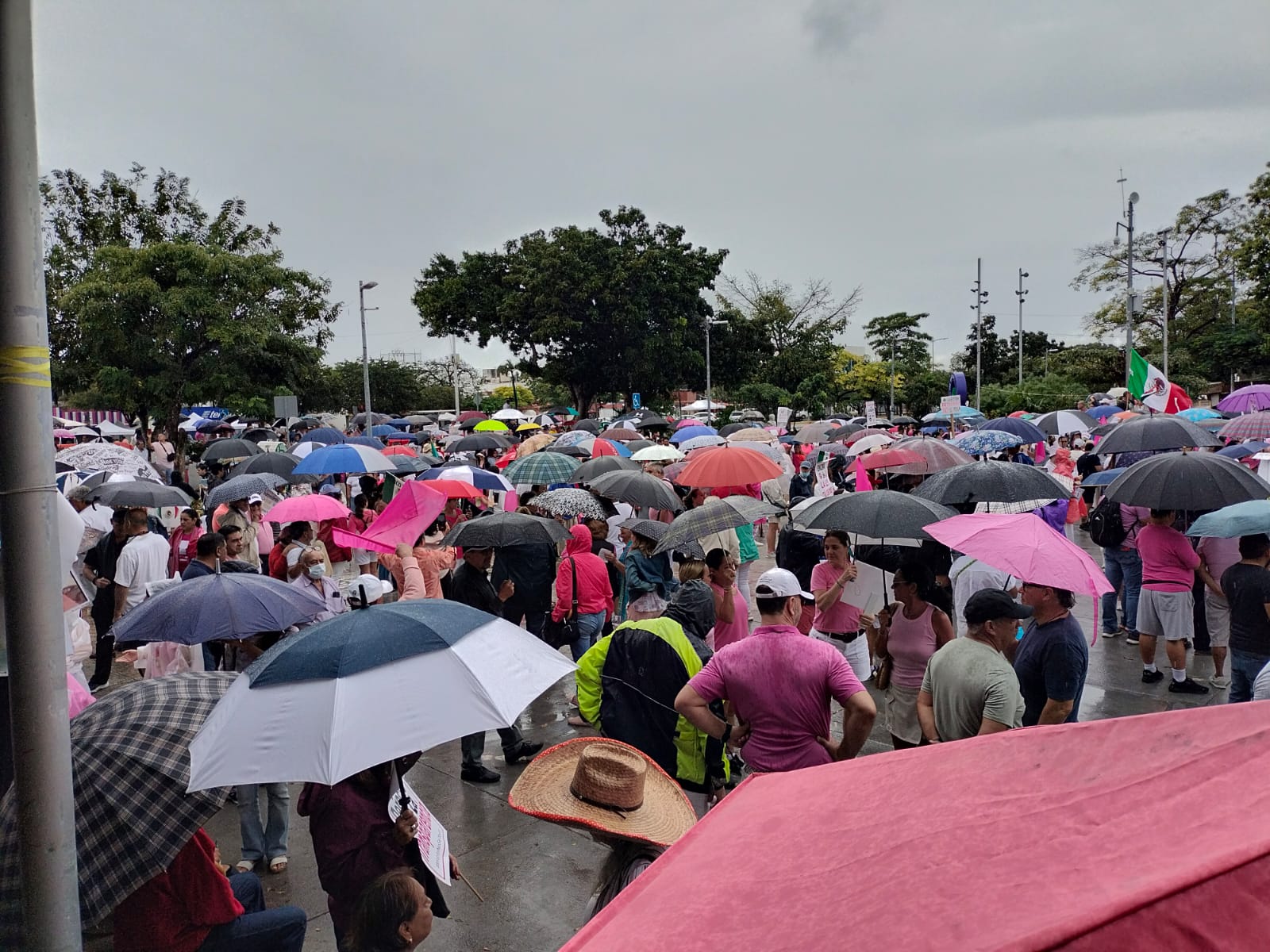 Los participantes se reunieron a partir de las 10 de la mañana, vestidos de rosa y blanco, para después avanzar sobre avenida Tulum hasta la explanada, acompañados por una estruendosa batucada y protegidos con impermeables y paraguas.
