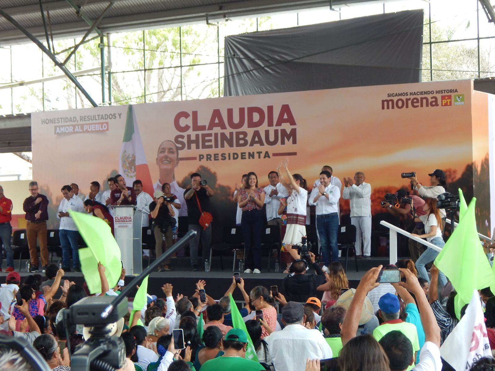 Acompañada de Eugenio Segura y Anahí González, candidatos al Senado, Claudia Sheinbaum comenzó este evento a las 11 de la mañana en los domos de la colonia Cecilio Chi.