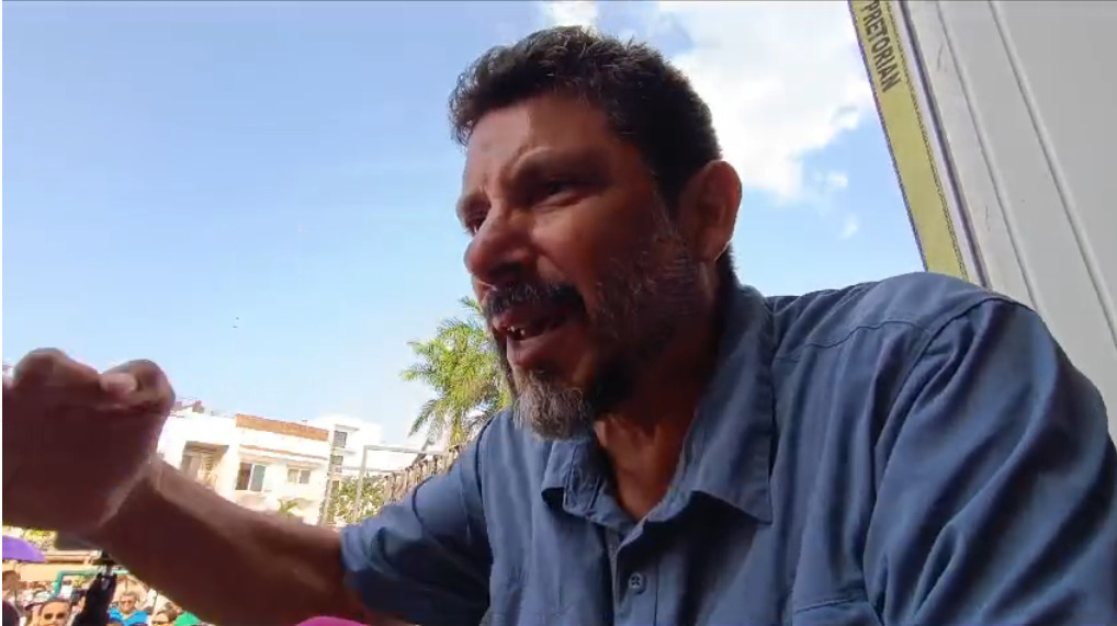 El activista se subió sobre una reja, a corta distancia del templete montado en la plaza 28 de Julio, junto al Palacio Municipal, y desde allí comenzó a gritarle a la candidata, para reclamarle por la destrucción de una cueva subterránea, por las obras del Tren Maya, sin obtener respuesta.