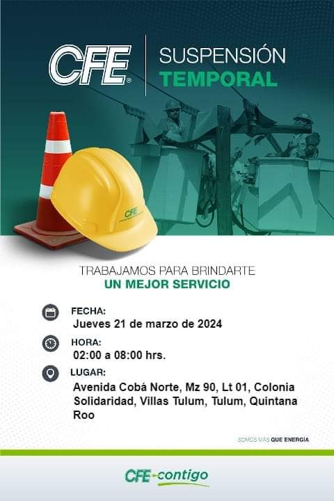 Tulum.- La Comisión Federal de Electricidad (CFE) informó mediante sus redes sociales que mañana suspenderá temporalmente el servicio en algunos puntos de esta ciudad por seis horas.