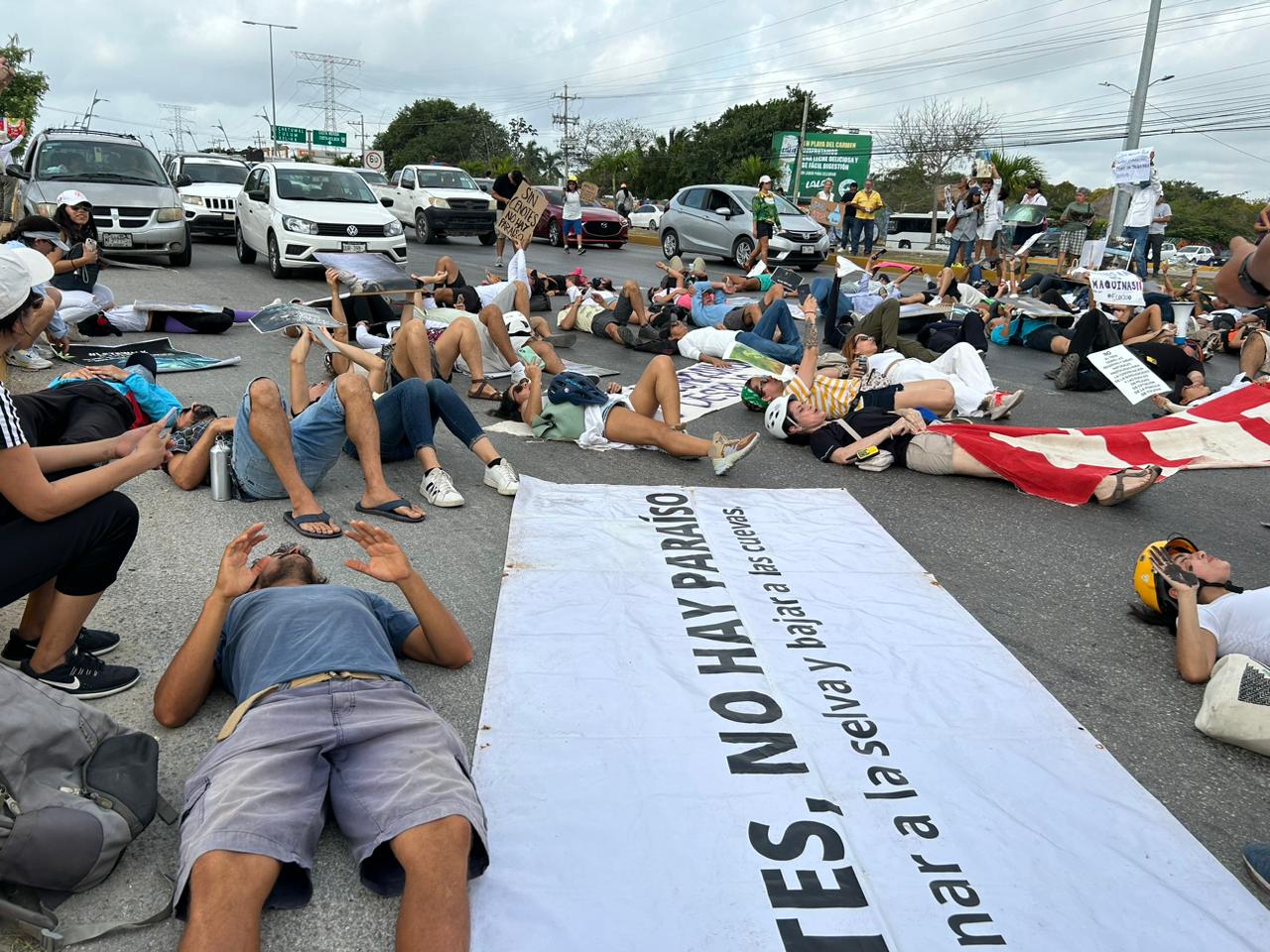 n grupo de más de 200 personas, la mayoría integrantes de agrupaciones ambientalistas, bloquearon esta mañana la carretera federal 307, a la altura de la calle 32 de esta ciudad, en sentido de sur a norte, para exigir que se acate la suspensión de las obras del Tren Maya, el Tramo 5 Sur, ordenado por un juez.