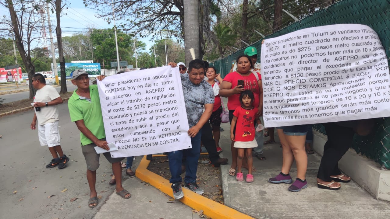 Los manifestantes portaron mantas donde explicaron su situación y acusaron a José Alberto Alonso Ovando, titular de Ageproo, de no respetar los acuerdos previos donde se estableció el precio de los predios, por lo que exigieron su destitución.