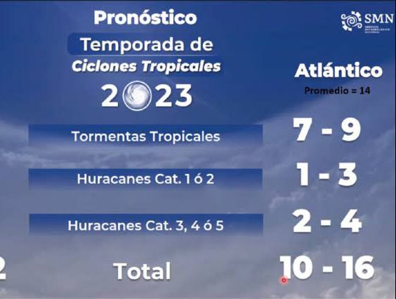 Según los expertos del total de ciclones tropicales generados, tanto para el Atlántico como para el Pacífico, al menos cinco impacten al país. En total, esperan de 35 a 45 sistemas desarrollados. En el Atlántico pronostican de 11 a 12 tormentas tropicales; de 5 a 6 huracanes, categoría 1 o 2; y de entre 20 y 23 huracanes categoría 3, 4 o 5. En tanto, para el Pacífico, esperan de 8 a 9 tormentas tropicales; 4 a 5 huracanes categoría 1 o 2; y de 3 a 4 huracanes categoría 3, 4 o 5.