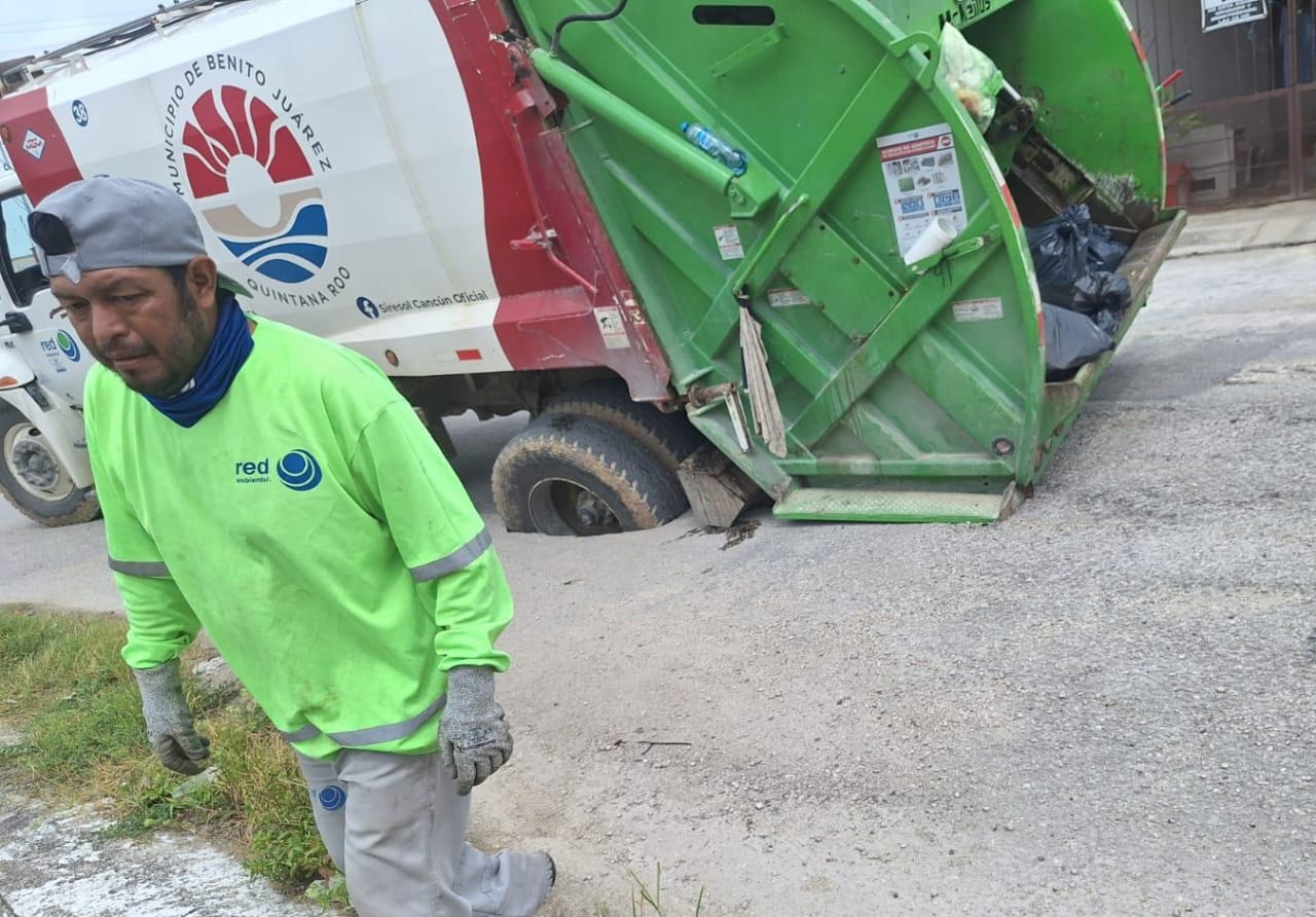 Continue readingSe estanca un camión recolector de basura en un socavón, en Cancún