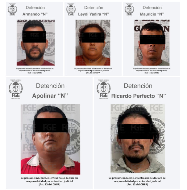 Lo anterior fue informado esta tarde por la Fiscalía General del Estado, a través de un comunicado en el que detalla que los sujetos fueron identificados como Apolinar “N”, Ricardo Perfecto “N”, Mauricio “N”, Armando “N” y Leidy Yadira “N”.