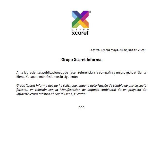 En un comunicado oficial, Grupo Xcaret, uno de los principales operadores turísticos del sureste mexicano, expresó que las aseveraciones sobre un supuesto proyecto en Santa Elena no se ajustan a la realidad.
