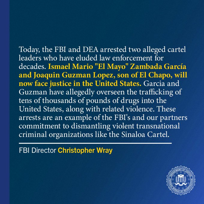 Según informó el director del FBI, Christopher Wray, la detención de estos dos capos fue posible “gracias a la fortaleza de las asociaciones” entre agencias federales como el Departamento de Seguridad Nacional y el Buró Federal de Investigaciones (FBI).
