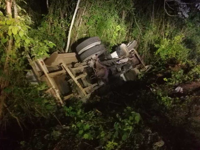 Un volquete, identificado con placas de circulación YT-2821-C del estado de Yucatán, se encontró fuera de la carretera, recostado sobre su lado izquierdo, aproximadamente a cuatro metros dentro de la maleza.