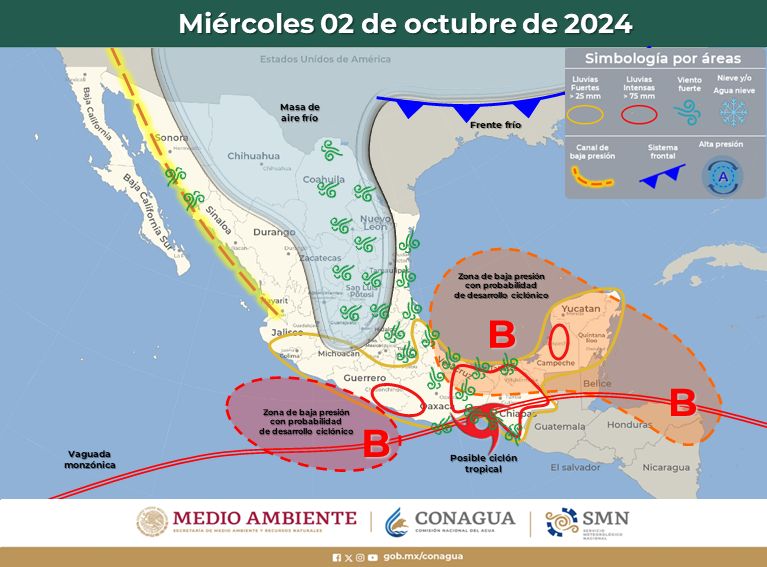 Por otro lado, el ingreso de humedad de ambos litorales y canales de baja presión sobre el occidente y centro del país, propiciarán chubascos y lluvias fuertes en el noreste, noreste, centro y occidente de la República Mexicana, incluido el Valle de México.