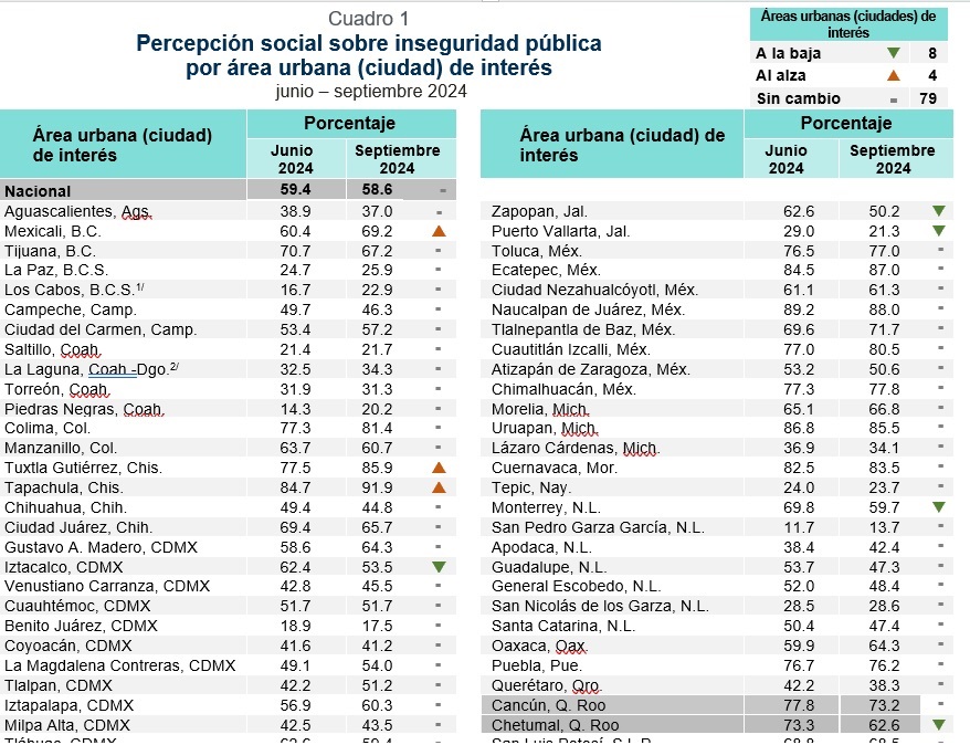 El Inegi detalla que con respecto a septiembre de 2023, en 27 áreas urbanas de interés hubo un cambio estadísticamente significativo en la percepción de inseguridad; en 18 se registró una disminución y en nueve, un incremento.