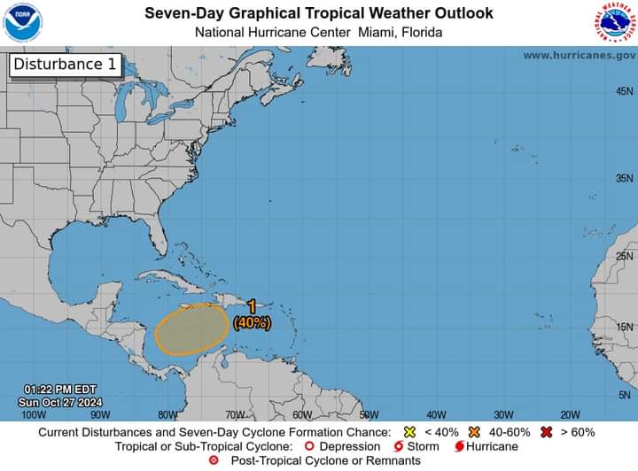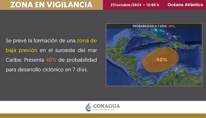 “Quintanarroenses, mantenemos en vigilancia la posible formación de una zona de baja presión en el suroeste del mar Caribe la cual AUMENTA 40% de probabilidad para desarrollo ciclónico en 7 días”, expresó.
