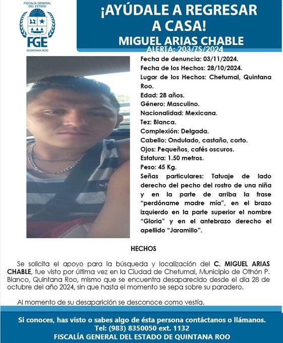 La solicitud de ayuda a la ciudadanía fue publicada el 4 de noviembre y busca reunir información que permita dar con su paradero. La desaparición de Arias Chablé ha encendido alarmas en la comunidad, que enfrenta un clima creciente de inseguridad.