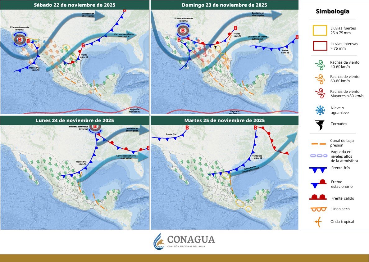 La Primera Tormenta Invernal y los Frentes Fríos 15 y 16 impactarán el país del 21 al 24 de noviembre. El SMN alerta sobre descenso de temperaturas, fuertes vientos (hasta 90 km/h), lluvias fuertes y nevadas en sierras de Baja California, Sonora, Chihuahua y Durango. Se prevé riesgo de torbellinos/tornados en Coahuila.