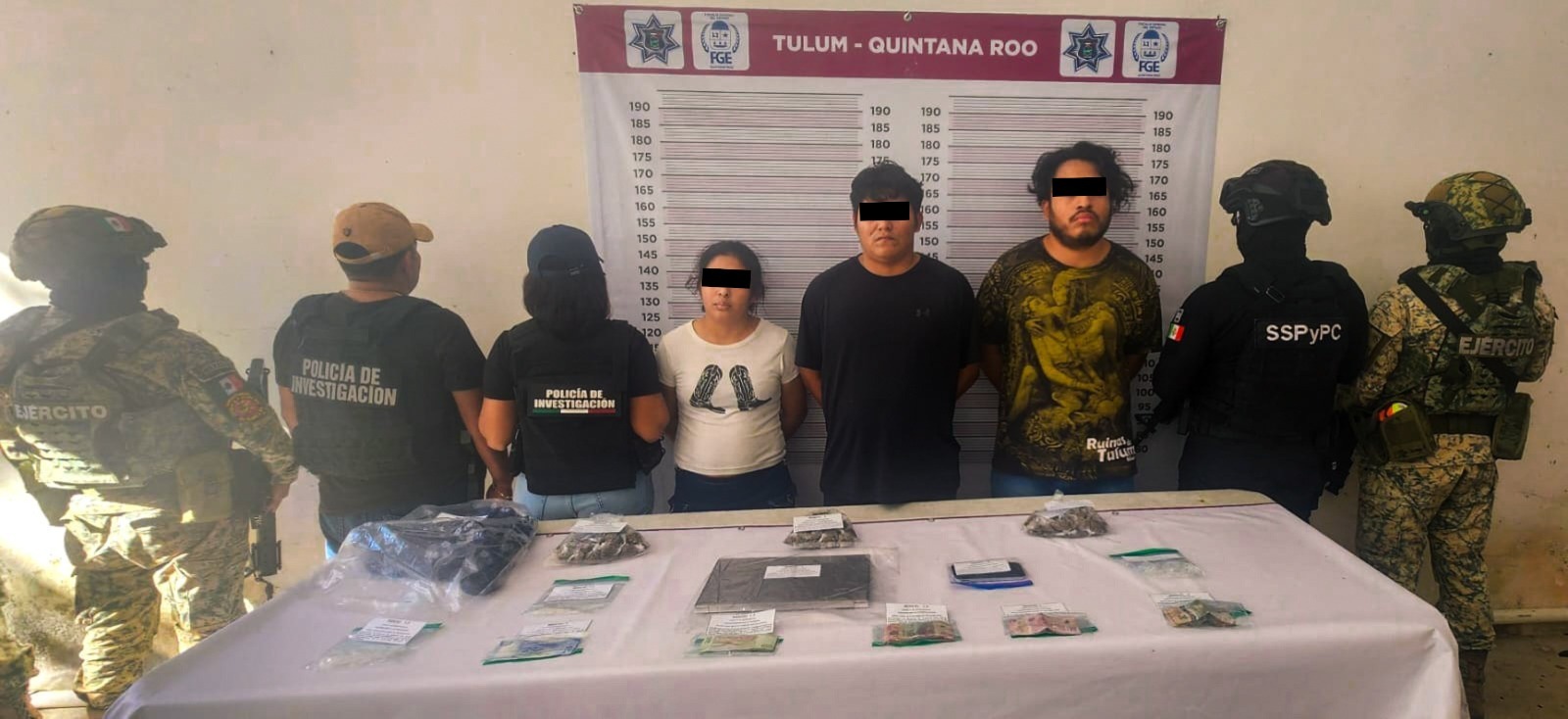 Autoridades de Quintana Roo detienen a tres por narcomenudeo en el centro de Tulum; los sujetos portaban drogas y objetos robados de un local comercial.
