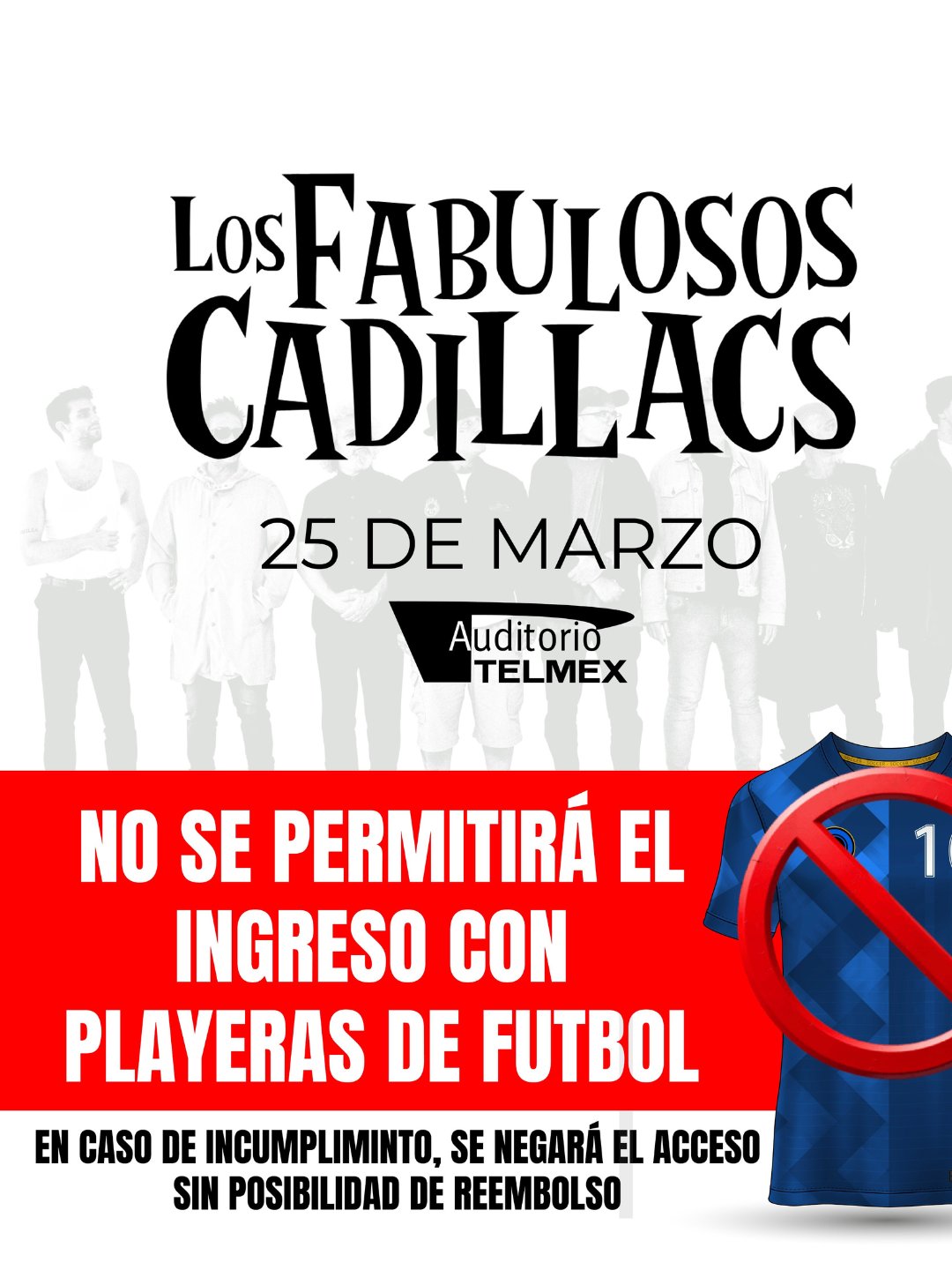 Ante el concierto de Los Fabulosos Cadillacs, el Auditorio Telmex anunció un control de acceso que impide la entrada con playeras de futbol, sin derecho a reembolso.