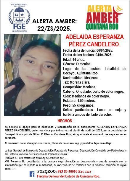 La Fiscalía General del Estado de Quintana Roo ha emitido una Alerta Amber para la localización de Adelaida Esperanza Pérez Candelero, una adolescente de 14 años desaparecida desde el 4 de abril en la comunidad de Cocoyol, en el municipio de Othón P. Blanco. Esta situación ha generado una creciente preocupación entre familiares y autoridades, quienes están movilizando esfuerzos para encontrar a la joven.