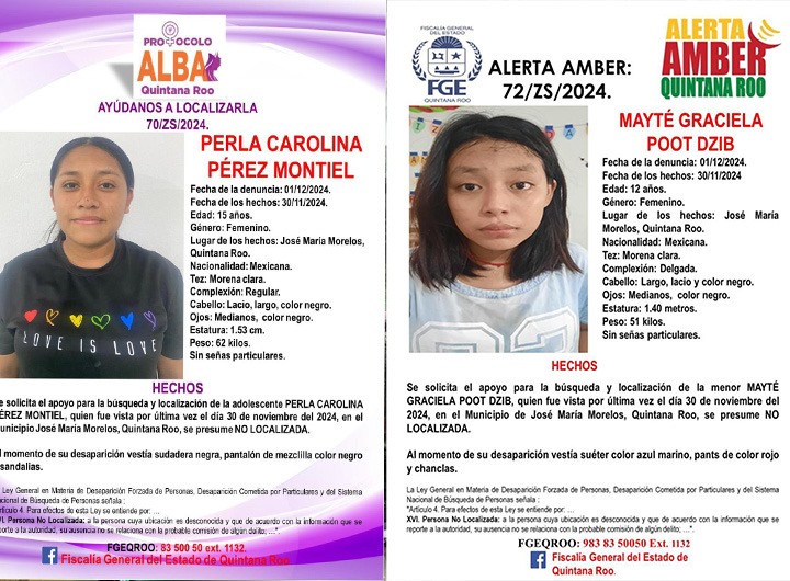 Según las fichas de búsqueda, Mayté Graciela Poot Dzib, de 12 años, y Perla Carolina Pérez Montiel, de 15 años, fueron vistas por última vez el 30 de noviembre.