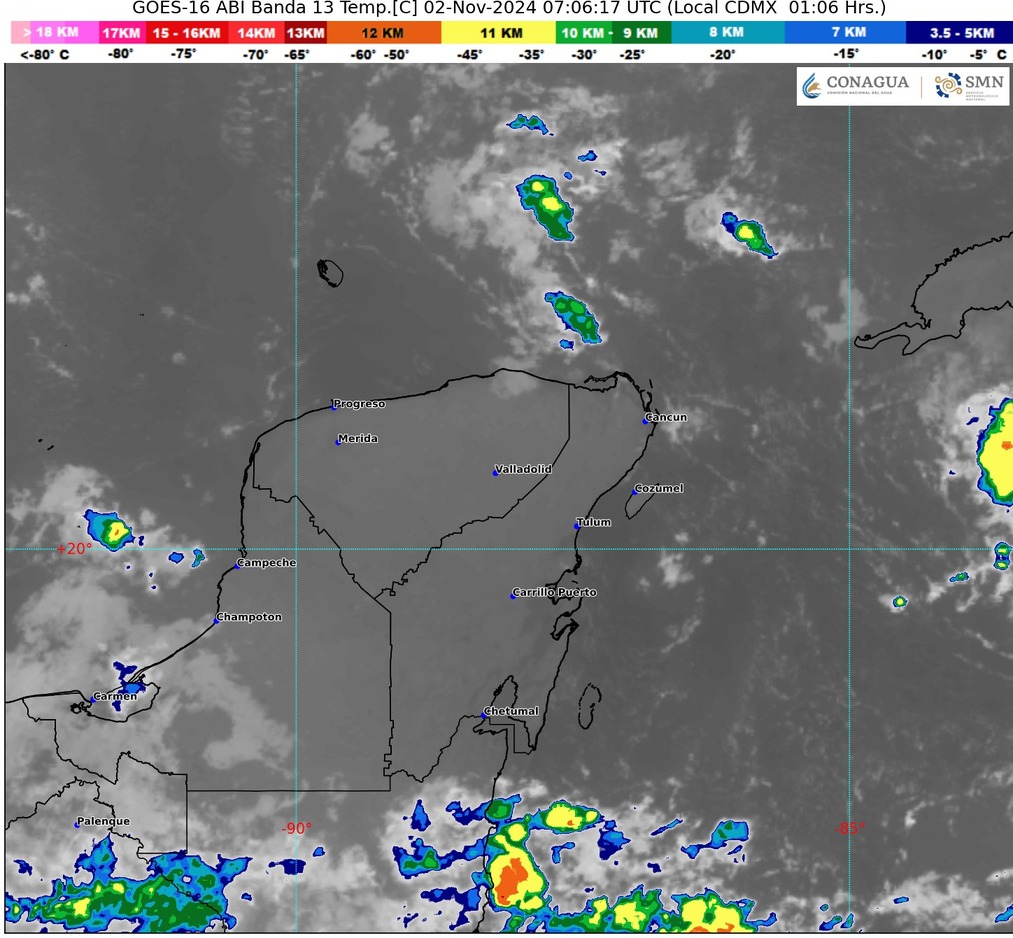 Lo anterior fue anunciado por el Servicio Meteorológico Nacional (SMN) y agrega que habrá chubascos con descargas eléctricas en Campeche; ambiente templado por la mañana y caluroso por la tarde; viento de componente este de 15 a 30 km/h en la región, con rachas de 40 a 60 km/h en costas de la península, así como oleaje de 1 a 2 m de altura en las costas de Quintana Roo.
