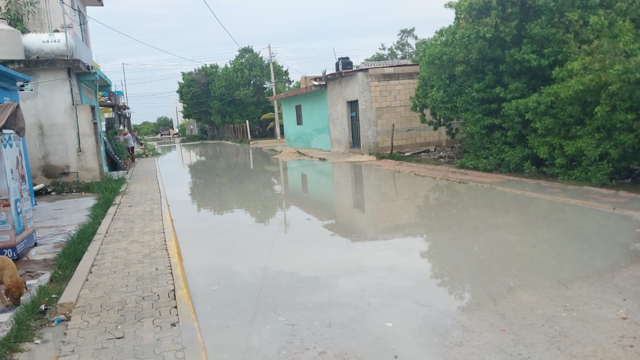 Kantunilkín.- El 80 por ciento de las calles de Holbox se encuentran inundadas, debido a las fuertes lluvias de estos últimos días, lo que ha vuelto muy difícil transitar en ellas.