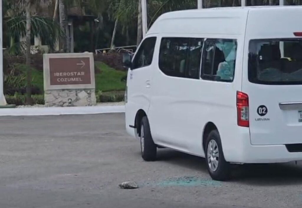 Cozumel.- Esta mañana, taxistas del sindicato “Adolfo López Mateo” lanzaron piedras contra una van de transporte federal con jn grupo de turistas a bordo, en la entrada del hotel Iberorestar.