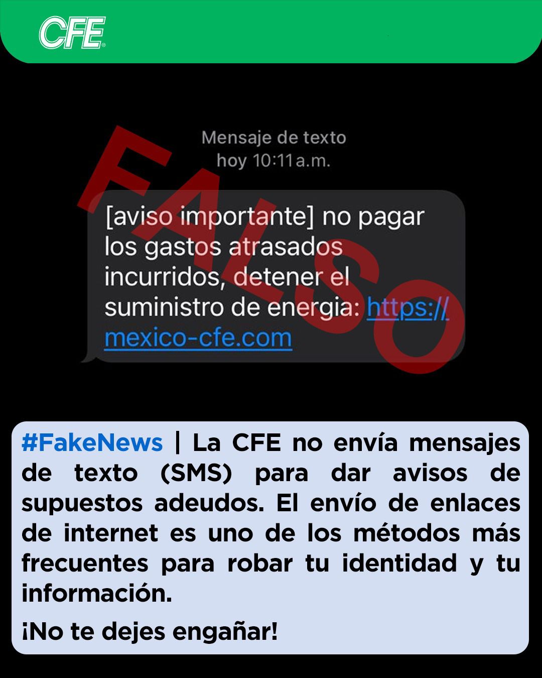 En el mensaje de texto (SMS) donde se muestra un logotipo similar al de la CFE que se lee “no pagar los gastos atrasados incurridos, detener el suministro de energía”, y se agrega el enlace https://mexico-cfe.com, el cual es utilizado por los presuntos delincuentes para el robo de información confidencial.