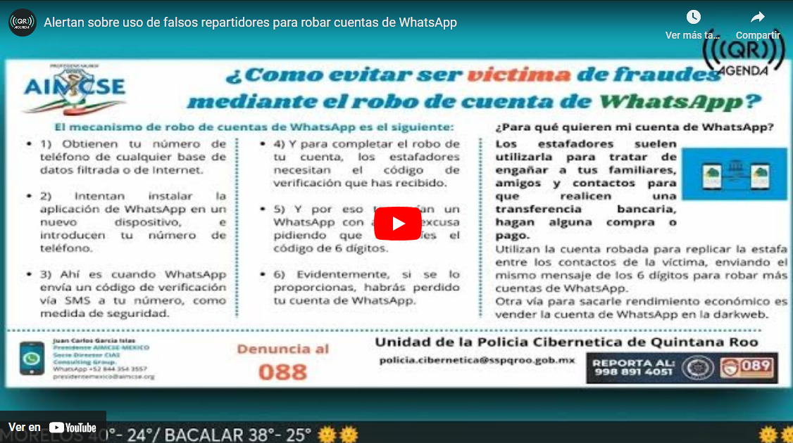 Juan Carlos García Islas, Presidente de la Asociación Internacional de Miembros de Cuerpos de Seguridad y Emergencias (AIMCSE) Capítulo México, nos comparte tips para evitar ser victima de fraudes y robo de cuentas de WhatsApp.