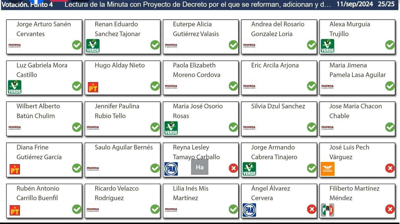 Chetumal.- Con 21 votos a favor y 4 en contra, la XVIII Legislatura de Quintana Roo, aprobó la minuta de reforma al Poder Judicial, que envió el Senado de la República, para los efectos constitucionales de contar con la mayoría de los 32 congresos locales y elegir a los ministros por voto popular.