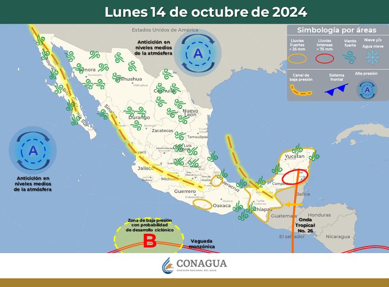 Así mismo, la onda tropical No. 26 se desplazará sobre la península de Yucatán, en interacción con un canal de baja presión sobre el golfo de México y el sureste mexicano, ocasionarán lluvias puntuales intensas en la mencionada península, así como lluvias fuertes a muy fuertes en el oriente y sureste del país. Circulación anticiclónica en niveles medios de la atmósfera continuará generando tiempo estable y baja probabilidad de lluvia sobre la Mesa del Norte y el noreste del país.