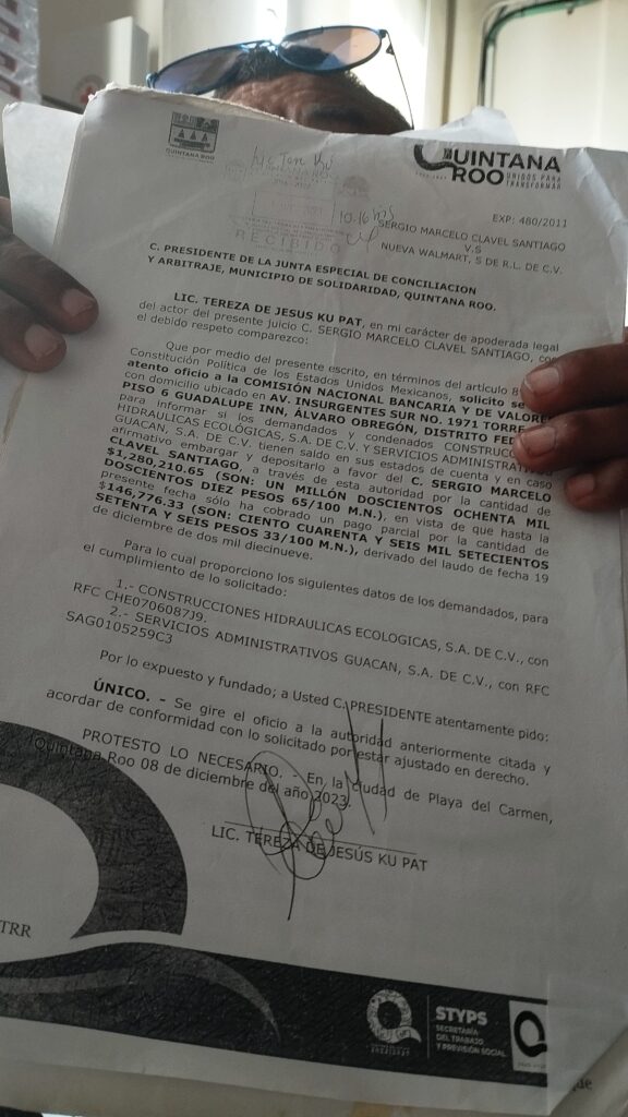 Playa del Carmen.- El ciudadano Sergio Marcelo Clavel Santiago solicitó la intervención de las autoridades de gobierno en su demanda laboral, en contra de dos empresas que brindaban servicios a Walmaet, la, que lleva 13 años sin solución.
