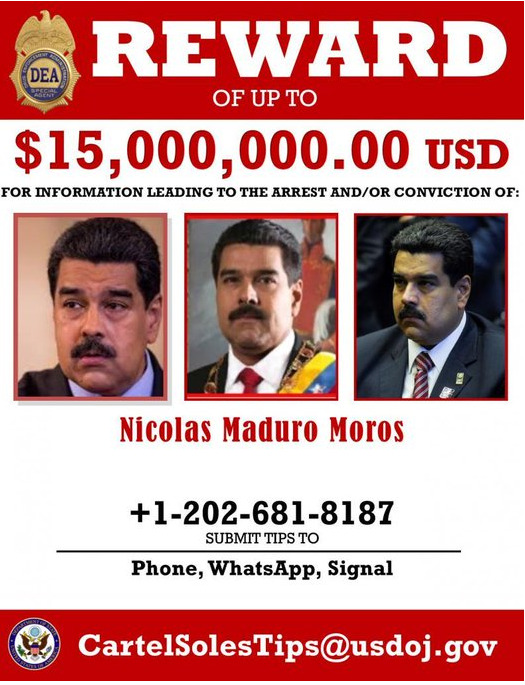 Estados Unidos, a través de la Administración para el Control de Drogas (DEA), ha puesto una recompensa de 15 millones de dólares por información que lleve a la captura del presidente venezolano Nicolás Maduro. Esta acción se basa en graves acusaciones de que Maduro lideró y administró una organización narcotraficante conocida como el Cártel de los Soles, presuntamente compuesta por altos funcionarios del gobierno venezolano.