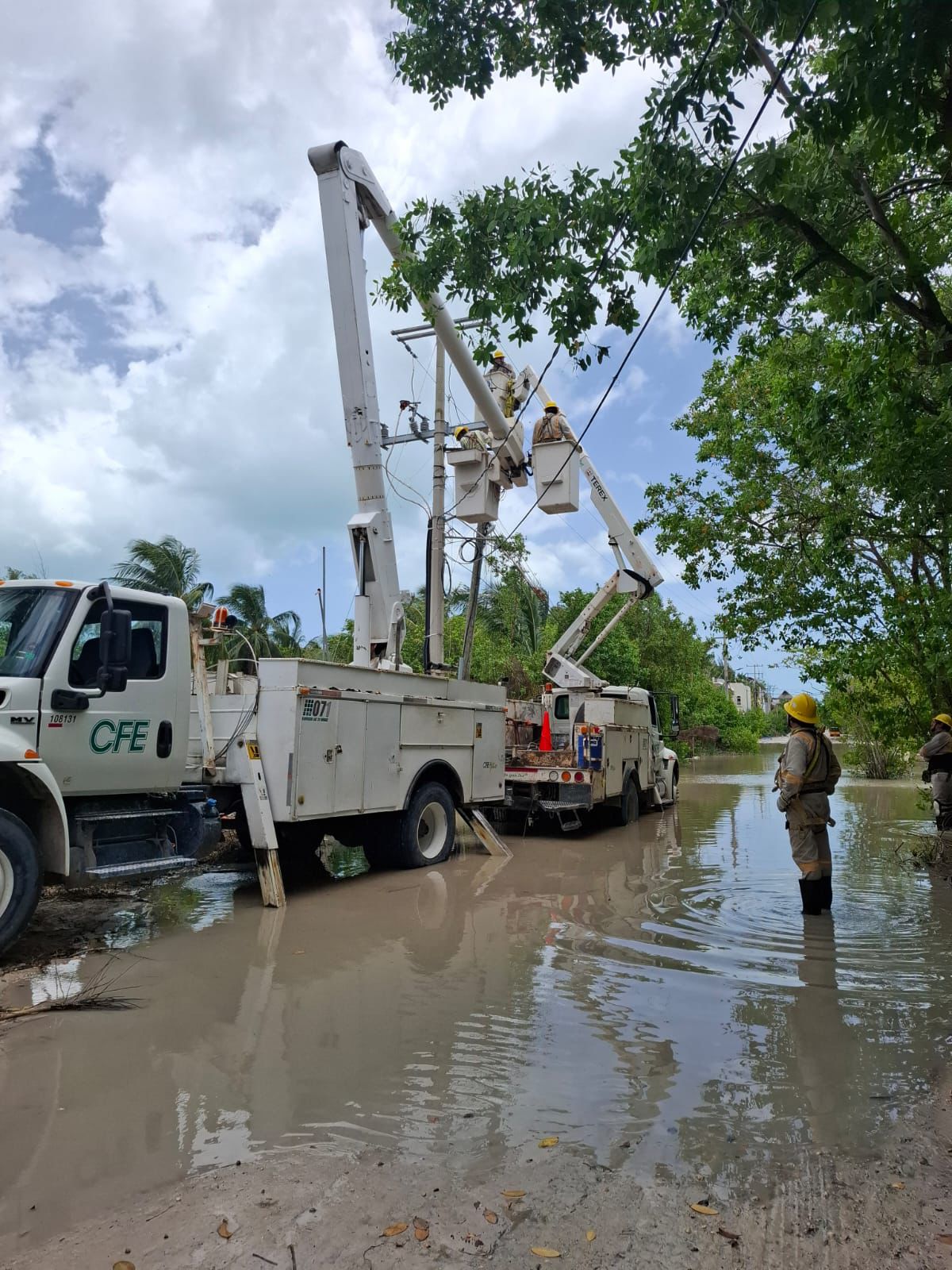 De acuerdo a fuentes oficiales, los equipos de la CFE se encuentran reemplazando postes, cambiando transformadores y realizando podas de árboles en Isla Mujeres, Cozumel y Holbox.