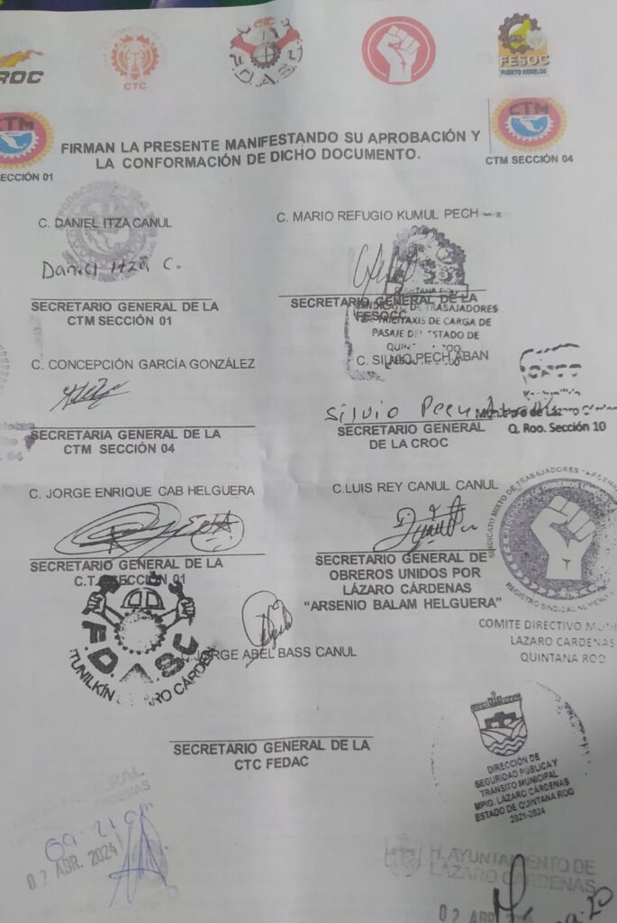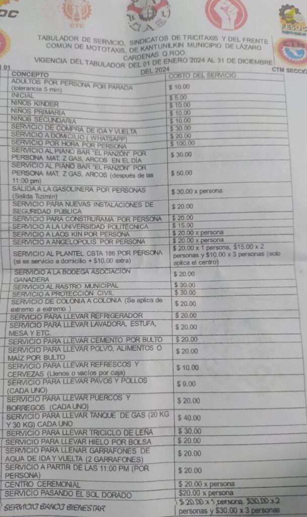 Agregó que para aquellas personas que quieran acudir a las instalaciones de Seguridad Pública, ubicadas en la salida de Kantunilkín, se les cobrará 20 pesos. El nuevo tarifario, que lleva la firma de los distintos líderes de los sindicatos, también trae el sello de la Dirección de Tránsito municipal, así como del propio Ayuntamiento de Lázaro Cárdenas. Este incremento ocurre a pocos meses del fin de la administración del presidente municipal Emir Bellos Tun, quien quedó fuera de la posibilidad de reelegirse al cargo.