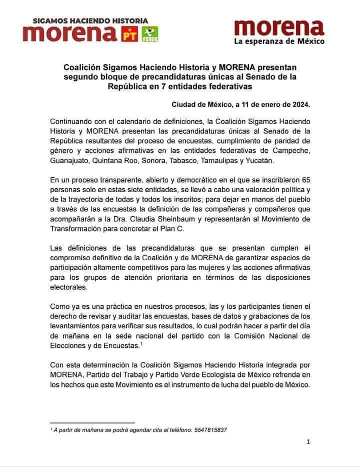 A través de un comunicado publicado en redes sociales esta madrugada, Morena, a través de su dirigente nacional Mario Delgado, detalló que estos nombres forman parte del segundo bloque de precandidatos al Senado que está conformado por los estados de Campeche, Guanajuato, Quintana Roo, Sonora, Tabasco, Tamaulipas y Yucatán.
