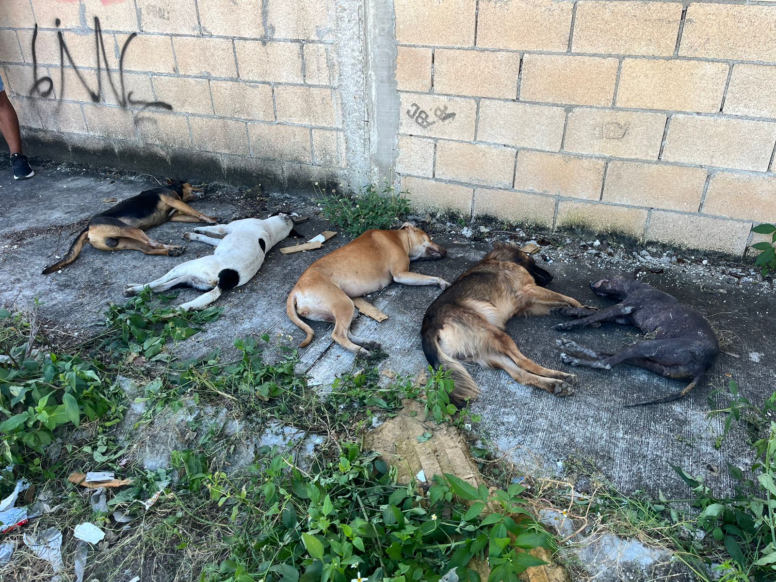 los denunciantes recogieron los cuerpos y los colocaron a pie de una barda, al lado de la calle, en tanto llegaban autoridades municipales de la Dirección de Bienestar Animal.