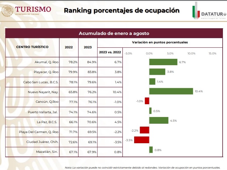En ese contexto, la Secretaría de Turismo del Gobierno de México (Sectur), a través de su portal “DataTur”, en su acumulado de enero a agosto, informó que Akumal, en la Riviera Maya es el destino con el mejor promedio de ocupación sostenida en los primeros ocho meses del año, con 84.9%; seguido de Playacar, con el 83.8%; Cancún con 76.1%; y Playa del Carmen con 69.5%.