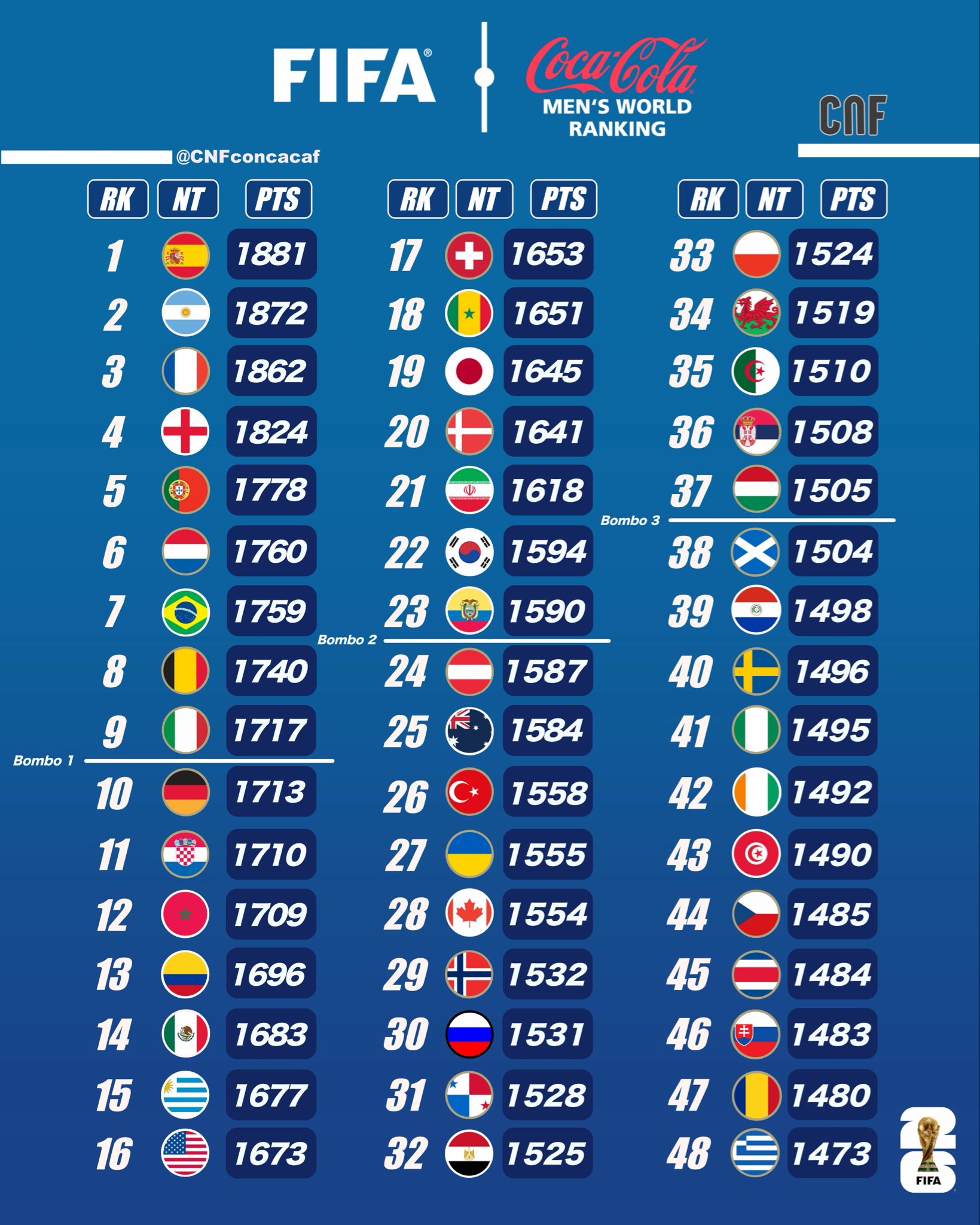 España domina el ranking FIFA; México conserva su posición 14
