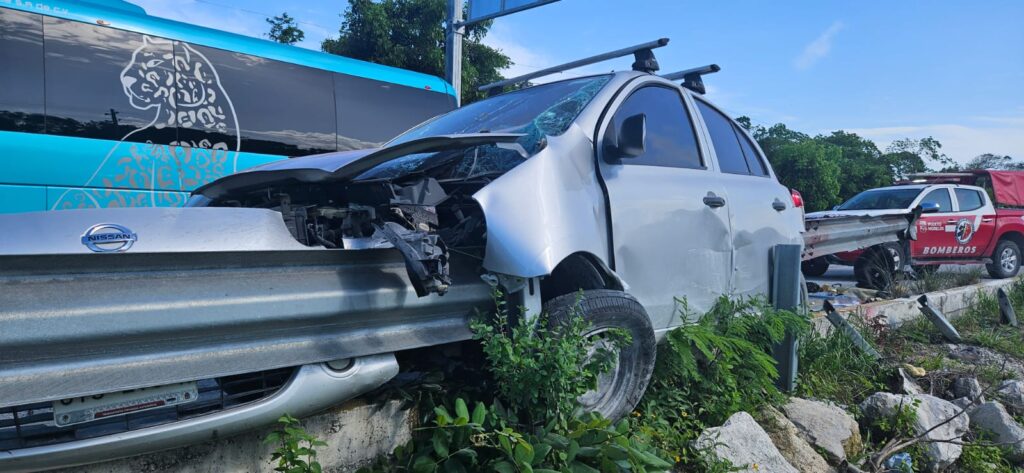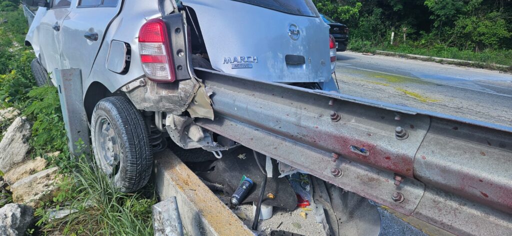 Cancún.- Un automóvil chocó de frente contra el inicio de una valla de contención, en el kilómetro 318 de la carretera federal 307, cerca del acceso a Puerto Morelos, lo que hizo que su conductor quedara gravemente herido y después falleciera, la tarde de hoy miércoles.