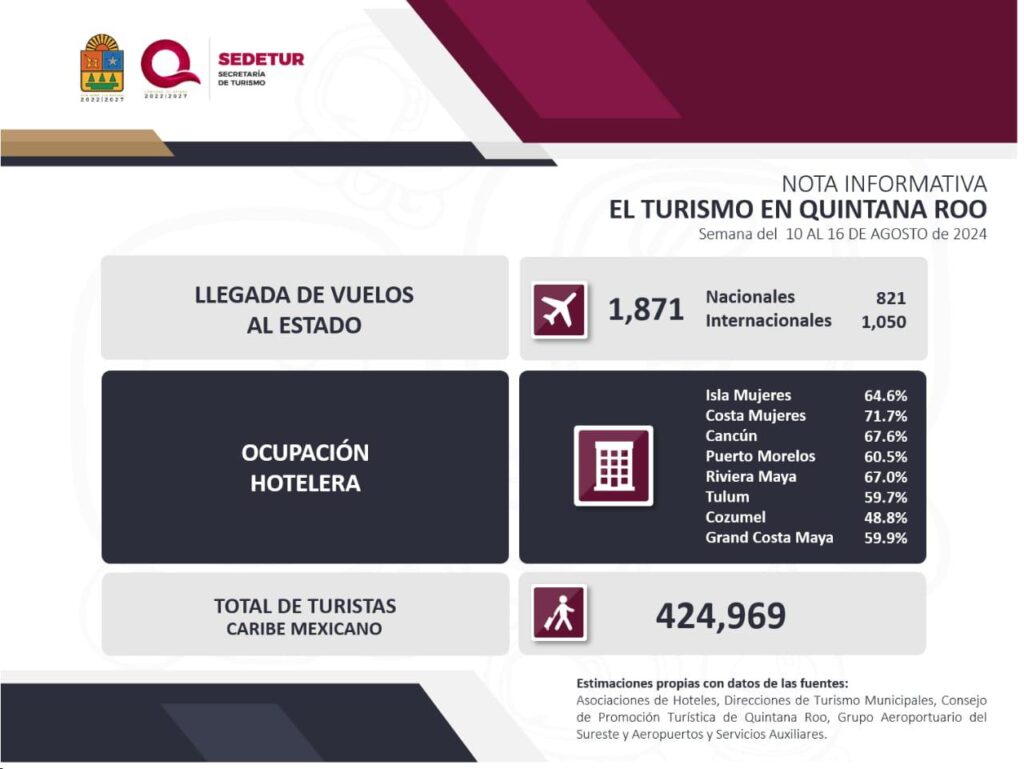 Esto lo explicó David Ortiz Mena, presidente de la Asociación de Hoteles de Tulum, quien detalló que en agosto se tiene una ocupación promedio de 59% en Tulum y de 66% en el Caribe Mexicano; cuando en ese mismo mes de 2023, las cifras fueron de 65% para Tulum y de 71% para Quintana Roo.