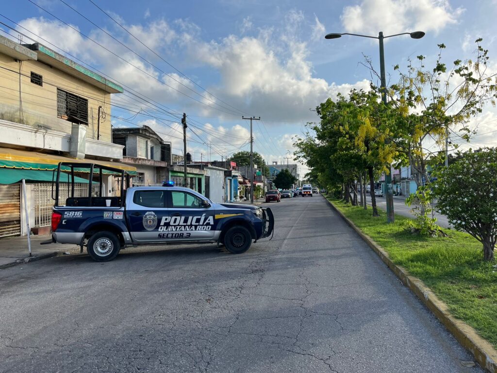 Los sicarios dispararon en al menos 10 ocasiones en contra de este taxi, con número económico 2140, del Sindicato “Andrés Quintana Roo”, para de inmediato darse a la fuga. Ambas víctimas recibieron múltiples impactos de bala, quedando el vehículo detenido en esta esquina, que corresponde a la Región 91.