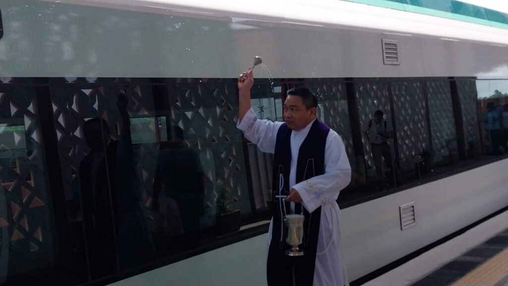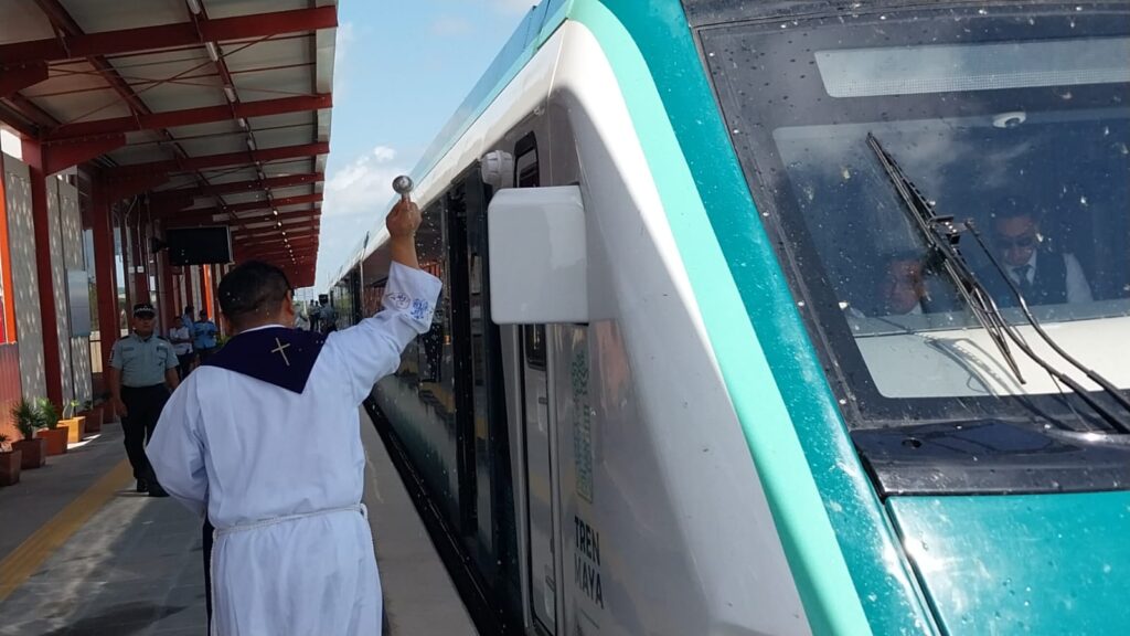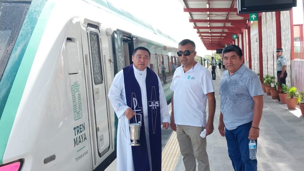 Kantunilkín.- Esta mañana, el parroco de la iglesia Inmaculada Concepción de María bendijo los vagones del Tren Maya y la estación de la comunidad de Nuevo Xcan, recién inaugurada, al sur del municipio de Lázaro Cárdenas.