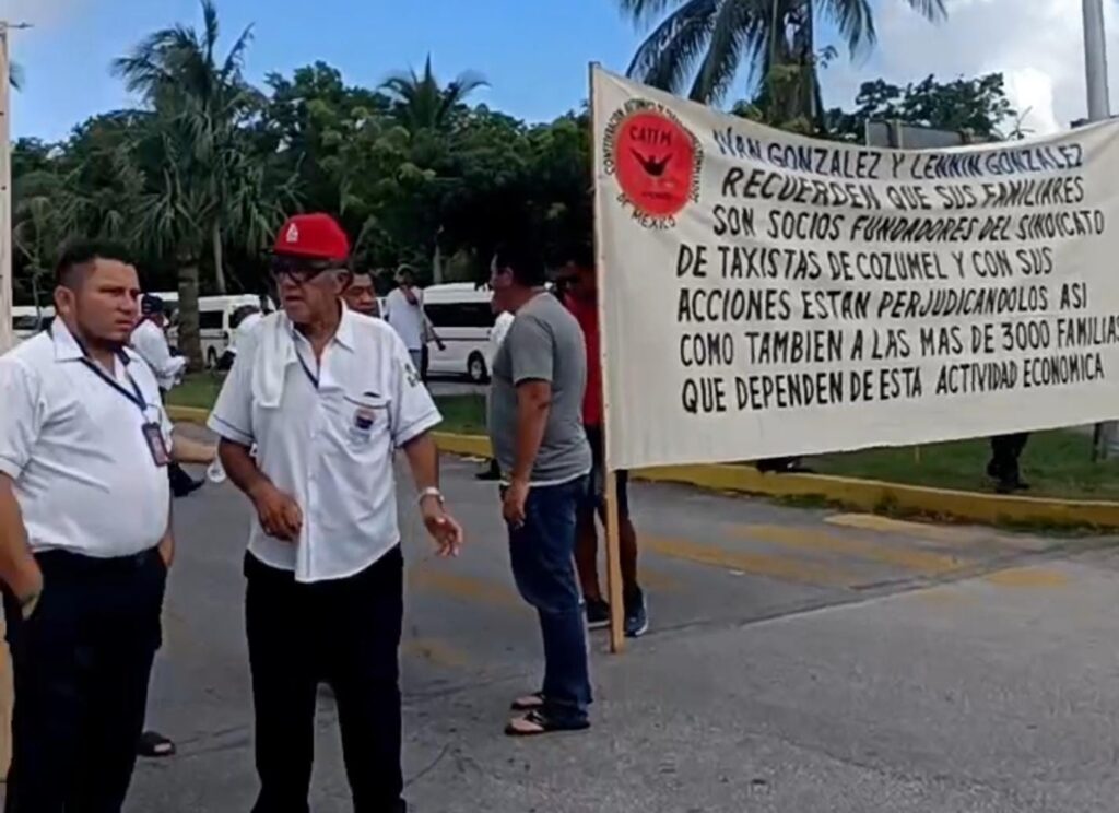 Cozumel.- Un grupo de aproximadamente 150 taxistas del sindicato “Adolfo López Mateo” bloquearon la entrada hacia el aeropuerto para protestar por la entrada de transporte con placas federales.