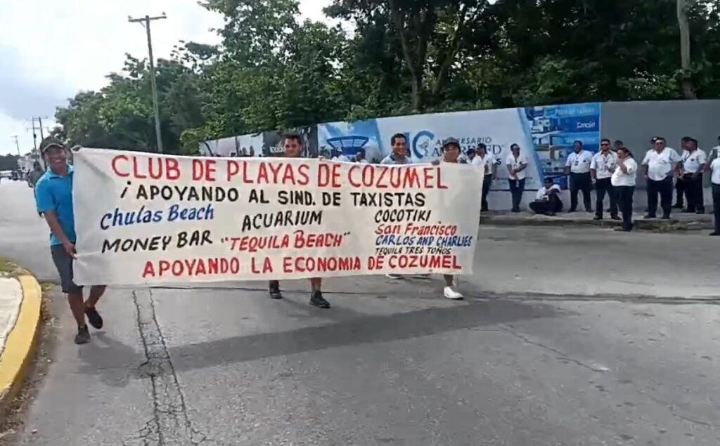 Los manifestantes portaron mantas donde se leía “Mario Peralta pretendes llenarte los bolsillo acosta de la gente trabajadora de Cozumel” y “solicitamos su apoyo gobernadora, no al transporte ilegal”, entre otras cosas.