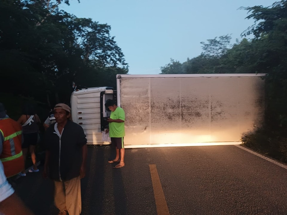 Kantunilkín.- Un camión de carga, equipado con una cámara fría, volcó la mañana de este viernes, bloqueando el tramo carretero El Ideal-Nuevo X-Can, al sur del municipio de Lázaro Cárdenas.
