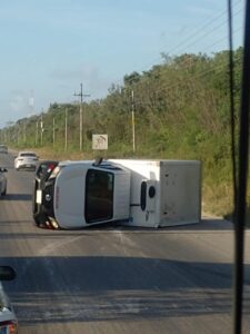 Una aparente mala maniobra del chofer hizo que esta pesada unidad se saliera de control y quedara acostada de costado sobre la carretera, en su tramo Cancún-Puerto Morelos, en sentido de norte a sur.
