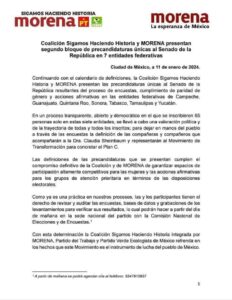 A través de un comunicado publicado en redes sociales esta madrugada, Morena, a través de su dirigente nacional Mario Delgado, detalló que estos nombres forman parte del segundo bloque de precandidatos al Senado que está conformado por los estados de Campeche, Guanajuato, Quintana Roo, Sonora, Tabasco, Tamaulipas y Yucatán.