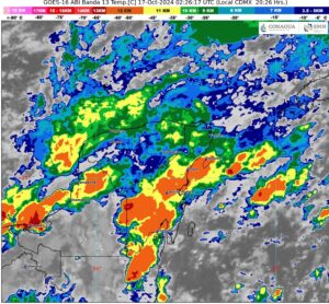 Por otro lado, un frente frío (No. 4) ingresará sobre el norte y noreste de México, interaccionará con un canal de baja presión extendido sobre el oriente y sureste del país, produciendo lluvias fuertes a puntuales muy fuertes en dichas regiones.