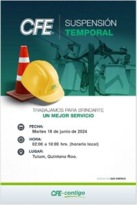 Mediante sus redes sociales, la paraestatal mencionó que el suministro de energía eléctrica de suspenderá temporalmente de las 2 de la madrugada a las 10 de la mañana, afectando a todo el municipio.