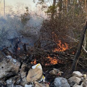 Dicho incendio se mantiene activo en el kilómetro 9 de la carretera Tulum-Cobá, cerca de la colonia Marites, donde esta tarde se encuentran decenas de cuerpos de emergencia.
